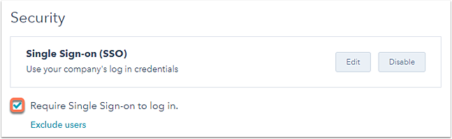 Please note: the user who selects the Require Single Sign-on to log in checkbox will automatically be added to the excluded users. It is recommended to exclude at least one user with Super Admin permissions. In the event your identity provider is down, they can log in and clear the Require Single Sign-on to log in checkbox to allow all users to log in with their HubSpot accounts.