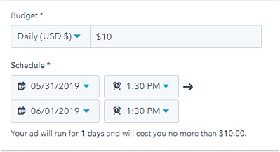 At the top of the page, click the Budget & Schedule tab.- Budget: click the dropdown menu and select whether your budget is for Daily or the Total amount for the ad, and enter the amount.