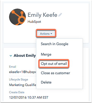 Please note: you need Marketing access permissions enabled to opt out an individual contact. Users with Sales Hub access only won't have this option.