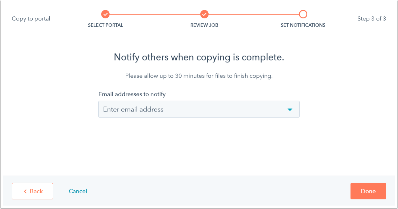 - In the Set notifications step, use the Email addresses to notify dropdown menu to choose an email address to notify when copying process is complete.