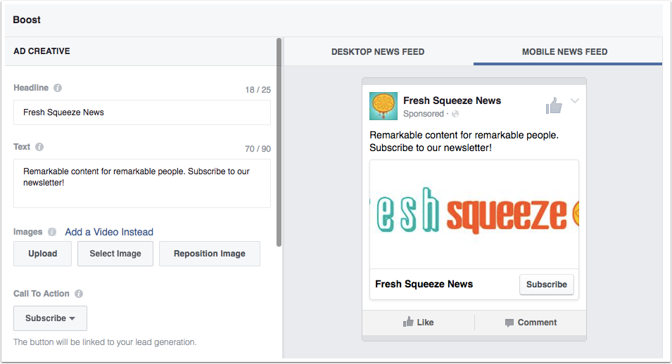 - In the Ad Creative section, set the format, headline, text, image, and call-to-action for your lead ad.