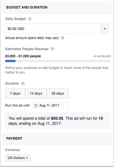 - Set your Daily Budget. The actual amount spent daily may vary, as determined by Facebook based on the opportunities for results each day. A minimum of $5.00 is recommended. Review the Estimated People Reached to see how many people you can expect to reach based on your selected audience and budget.