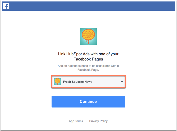 - In the dialog box, click the dropdown menu and select the Facebook page to link to HubSpot Ads. Then, click Continue.