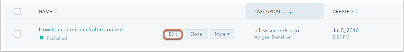 - Locate and hover over the blog post you wish to move, then click Edit.