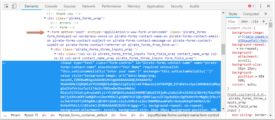 The Chrome DevTools Elements panel will open in the browser. In the Elements tab, the code for the form field should be highlighted.