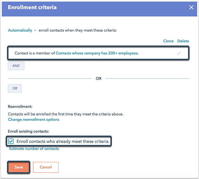 First, click Set enrollment criteria and set the workflow to enroll contacts who joined the list you created (in this example, the newly created "Contacts whose company has 200+ employees" list is used). If you would like to enroll all existing contacts that meet this criteria, be sure to check Enroll contacts who already meet these criteria, then click Save.