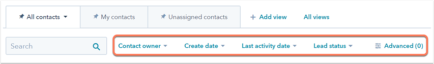You can further filter the contacts in the table, even when you're in a view.- Click one of the default contact property dropdown menus above the table and select the values that you want the displayed contacts to have. Learn more about the default contact properties.