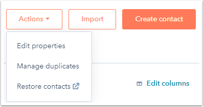 - Manage duplicates: select to parse through possible duplicate contacts that HubSpot identifies for you. Only users with Account access and edit access for contacts and companies can deduplicate contacts and companies, if the HubSpot account has access to the duplicate management tool.