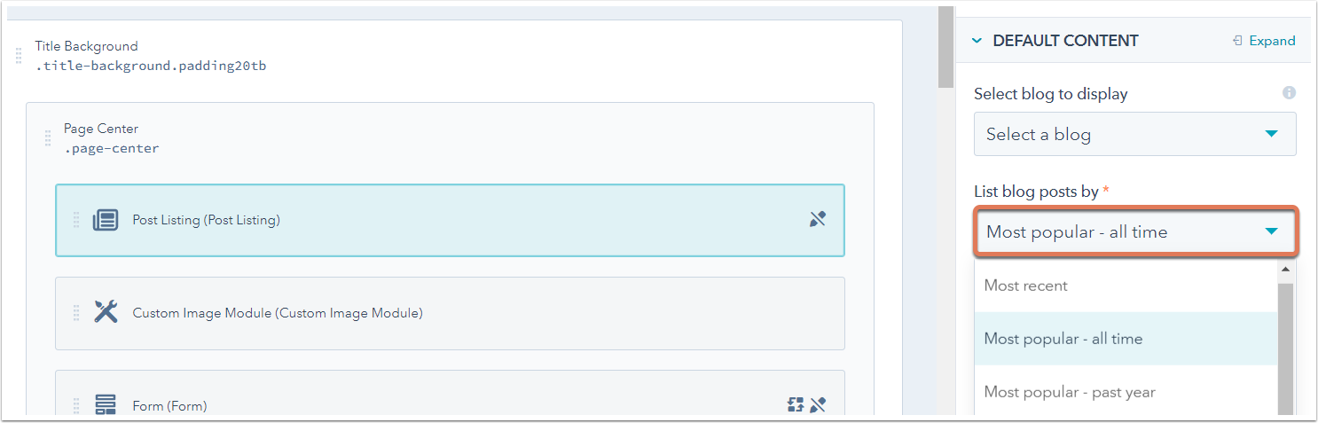 To list your most popular blog posts on your HubSpot blog, add a Post Listing module to your blog template. The order of blog posts you will see displayed in this module are the blog posts with the most views from greatest to least.