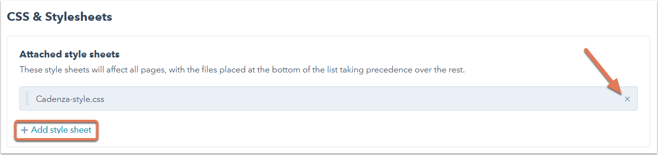 - On theTemplates tab, scroll to CSS & Stylesheets. To add a stylesheet, click + Add style sheet. Click the X beside an attached stylesheet to remove it.