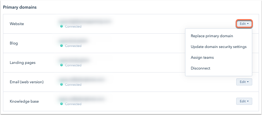 To change the primary domain for your HubSpot-hosted content, add your new domain as a redirect domain first. Then replace your existing primary domain with the new domain. Marketing Hub Enterprise accounts can use different subdomains for individual blogs, landing pages, and website pages.