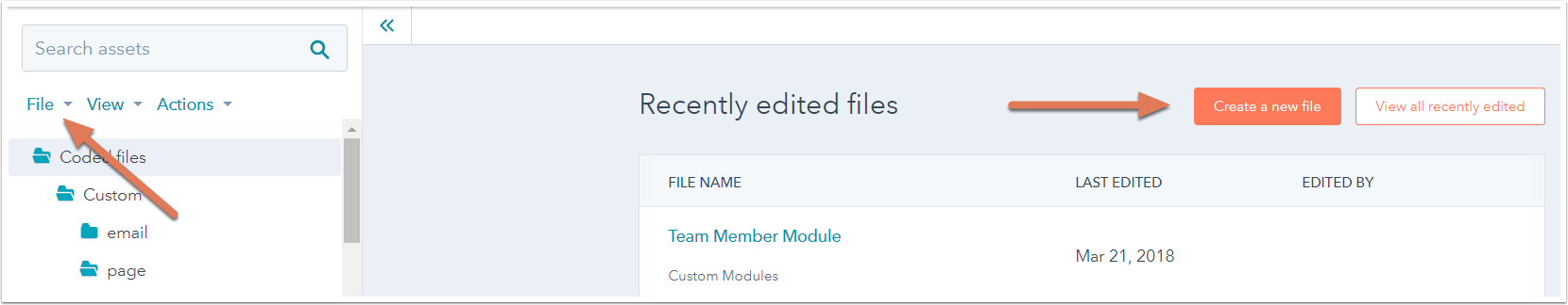 - Expand the right sidebar menu if needed by clicking the folder folder icon. Then click the File dropdown menu and select New file. Alternatively, if you don't have any tabs open in your design manager, you can click Create a new file in the upper right-hand corner.