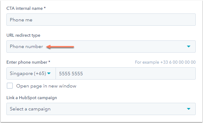 - Enter tel:5555555555 in the URL field, replacing 5555555555 with the phone number for your business. You don't need to select the Open link in new window checkbox, since this type of link will open the visitor's default calling program on their device.