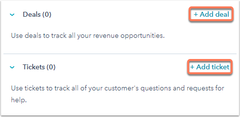 - In the right panel, locate the relevant object section and click Add [record]. For example, if you want to associate a deal with the record you're in, look for the Deals section and click Add Deal.