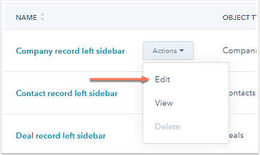 - To edit an existing record sidebar, hover over the name of the sidebar, click the Actions dropdown menu and select Edit.