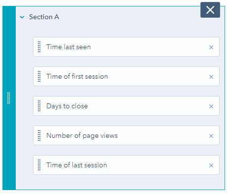 - To remove a property from a section, click X to the right of the property. This may not remove the property from a user's view of the same section because each user can customize their own view of that section.