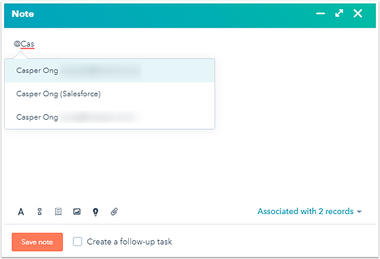 In HubSpot, you can add notes to records. Mentioning a team member in your note helps to alert them to the note.