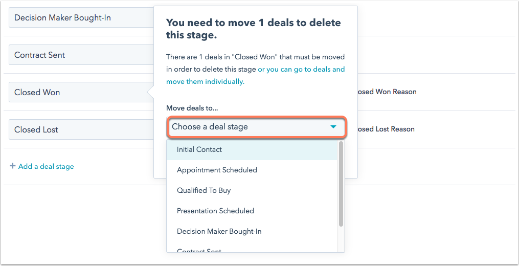 - If you're deleting a deal stage that contains at least one deal, you'll be prompted to move these existing deals to another stage. Click the Choose a deal stage dropdown menu to select the stage the deals should be moved to.