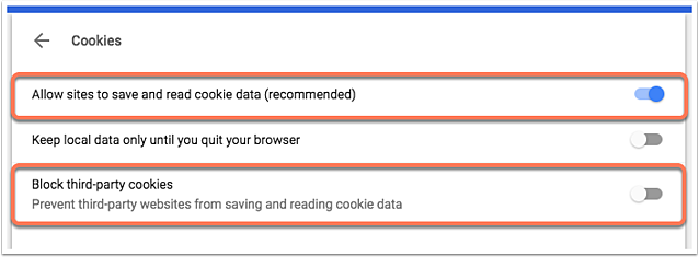 - Click to toggle the Block third-party cookies switch off, and ensure that the toggle beside Allow sites to save and read cookie data (recommended) is on.