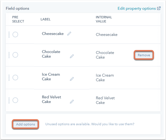 Customize form field options Last updated: June 26, 2020 By default, all values in a contact property are available as form field options. However, you can customize the available field options on an individual form basis. In your HubSpot account, navigate to Marketing > Lead Capture > Forms. Click the name of an existing form or create a new form. In the form editor, click a field to customize its options. In the left panel, Field options section: To remove current options, hover over the option and click Remove. To add unused options, click Add options at the bottom of the section. In the dialog box, select the option(s) to add and click Add. In the top right, click Publish to update the live form. Learn more about adding new options to a form field or removing a property value as an option from all forms. Forms