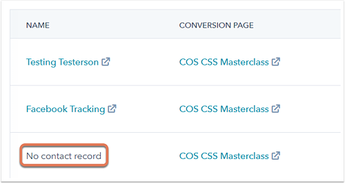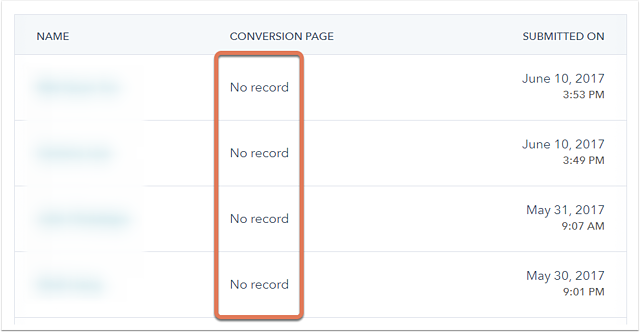 If you see a 'No record' conversion page in your form submission, this means HubSpot wasn't able to determine where the submission occurred. This could be due to two reasons: