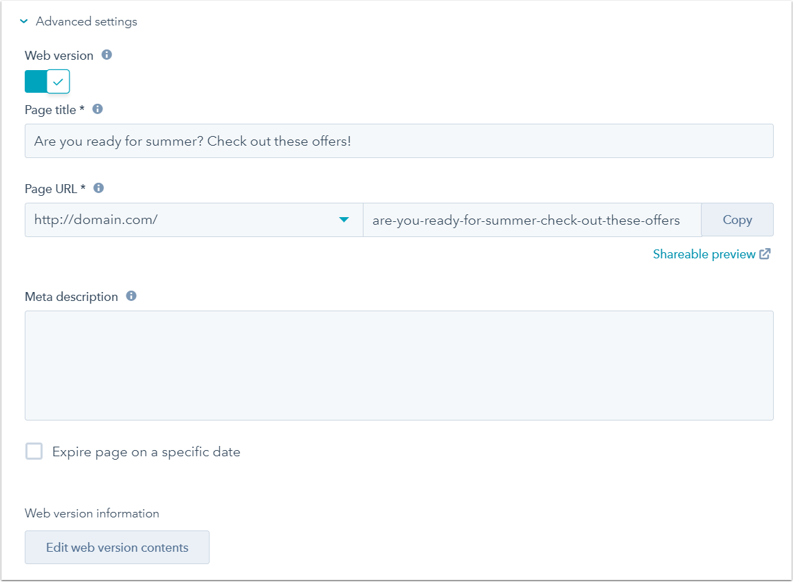 - (Optionnel) Expirer la page à une date spécifique : cochez la case Expirer la page à une date spécifique si vous souhaitez rediriger la version web de l'e-mail vers une page HubSpot ou une URL externe à une date et une heure prévues.