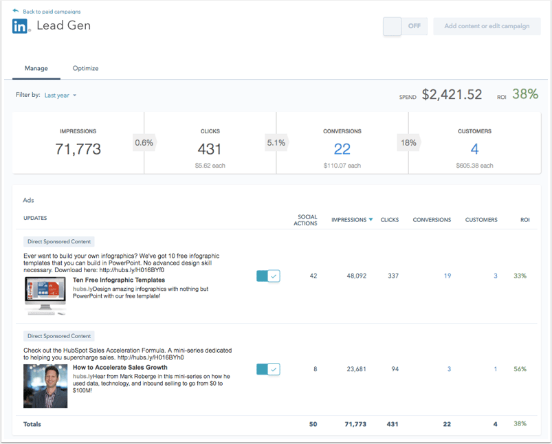 Les campagnes que vous avez créées apparaissent dans le tableau des campagnes, qui montre des indicateurs tels que les coûts, le taux de conversion et le ROI de chaque campagne. Pour les analyser en détail, cliquez sur le nom d'une campagne.