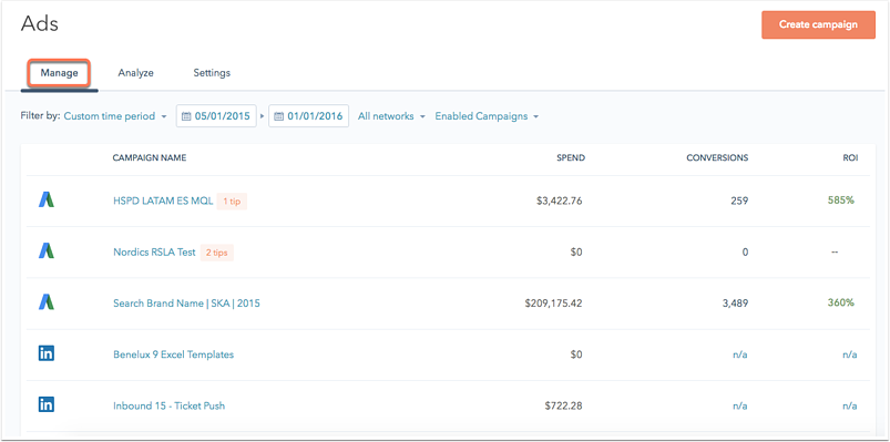 En cliquant sur l'onglet Gérer, figurant en haut du tableau de bord, vous obtiendrez la liste de vos campagnes. Les menus déroulants situés sous les onglets Gérer, Analyser et Paramètres servent à filtrer les campagnes, qu'elles soient actives ou en pause, par date, réseau ou statut.