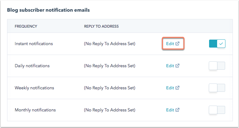 - Dans les E-mails de notification des abonnés au blog, cliquez sur Modifier pour ouvrir l’éditeur d’e-mails pour un e-mail de notification de blog spécifique. Les e-mails actuellement activés pour votre blog seront repérables grâce au bouton d'activation qui se présente en bleu.