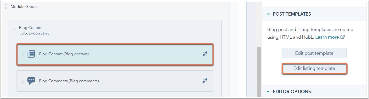 - Une fois dans le modèle, cliquez sur le module Contenu du blog. Dans l'inspecteur sous l'onglet Modifier, cliquez sur Modifier le modèle de listing.