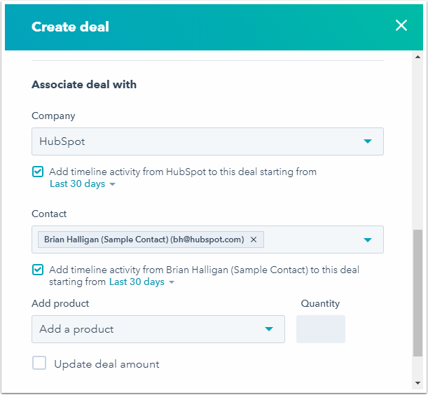 cliquez sur les menus déroulants Entreprise ou Contact , puis recherchez et sélectionnez l’entreprise ou le contact pour associer le nouvel objet.