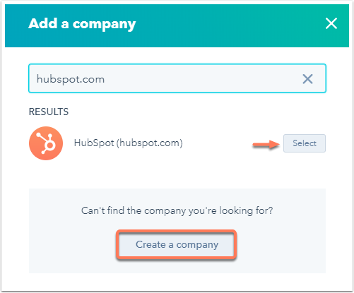 - Cliquez sur Sélectionner, à côté du nom de l'entreprise, pour l'ajouter à la fiche d'informations du contact en tant qu'entreprise associée.