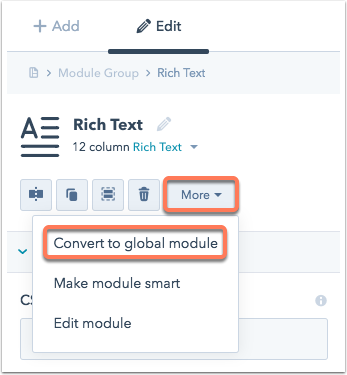 - Dans l'inspecteur, cliquez sur le menu déroulant Plus et sélectionnez Convertir en module global.