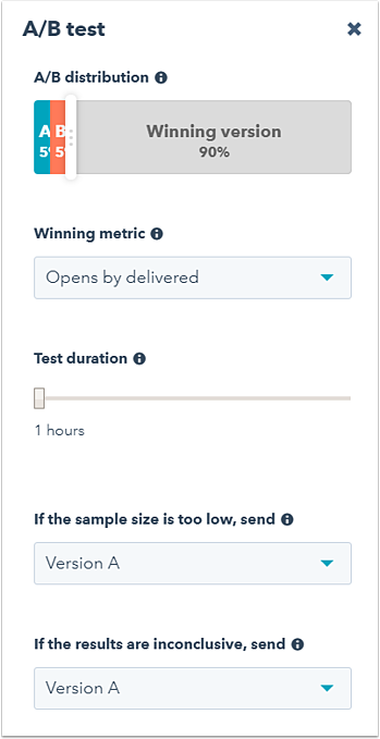 - Si les résultats ne sont pas concluants, envoyer : si les résultats de l'indicateur gagnant ne sont pas concluants après la fin du test, la version sélectionnée ici sera envoyée aux destinataires restants. Assurez-vous que votre e-mail est envoyé à un échantillon suffisamment important et que la durée du test est suffisamment longue pour recueillir des résultats. En savoir plus sur la façon dont le seuil statistique est déterminé dans un e-mail de test A/B.