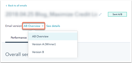 - Dans le coin supérieur gauche, cliquez sur le menu déroulant Version d'e-mail pour analyser les résultats de l'e-mail pour votre e-mail, ou pour l'une des variantes.