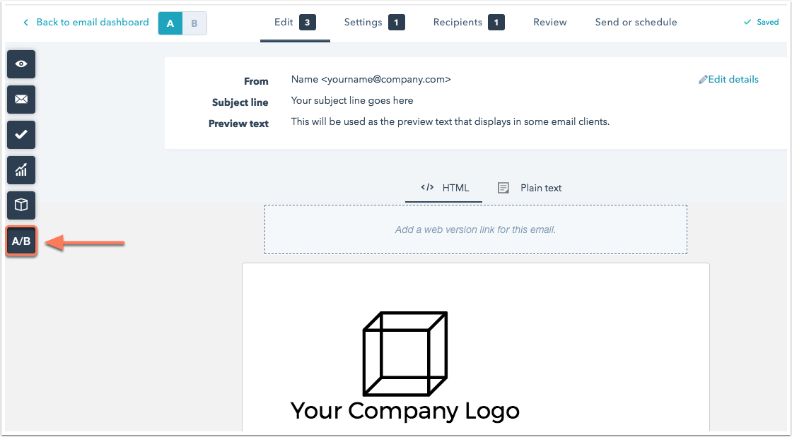 Une fois que vous avez modifié les variantes d'e-mails A et B, configurez vos options de test en cliquant sur l'onglet A/B sur la gauche de l'éditeur de contenu.
