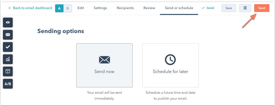 - Sélectionnez une heure spécifique pour planifier votre e-mail A/B ou cliquez sur Envoyer dans le coin supérieur droit pour envoyer l'e-mail maintenant.