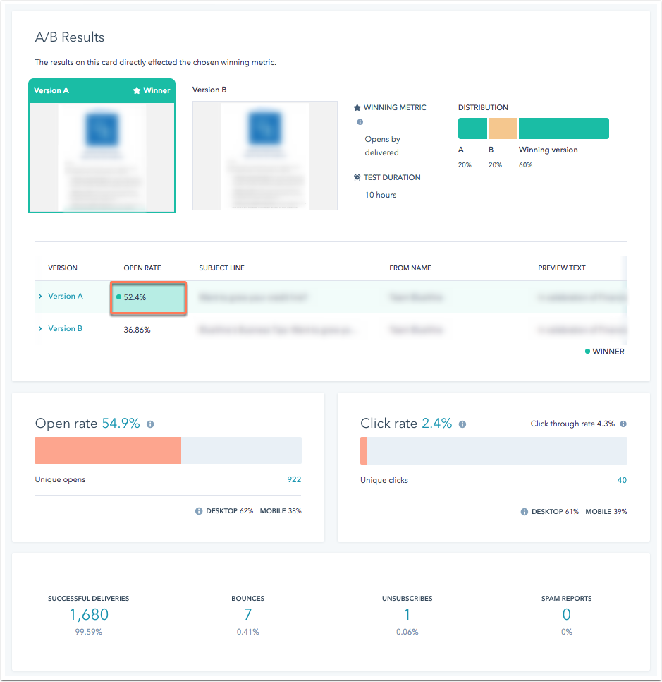- Cliquez sur le nom de votre e-mail A/B. Les résultats du test A/B seront récapitulés sur la page Performance. La version de l'e-mail et le critère gagnants seront surlignés en vert.