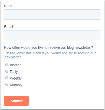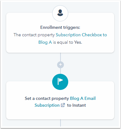 Si les contacts cochent la case et soumettent le formulaire, la valeur de propriété de cette case sera Oui. Cela les inscrira dans le workflow et mettra à jour leur propriété d'abonnement au blog vers la fréquence d'abonnement spécifiée.