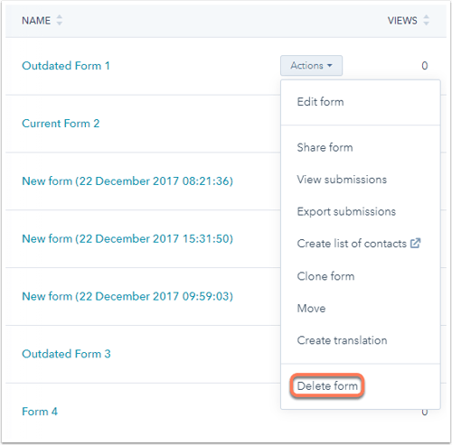Remarque : si le formulaire est actuellement utilisé par une page HubSpot, l'option Supprimer le formulaire apparaîtra en grisé. Retirez le formulaire de toutes les pages HubSpot pour supprimer le formulaire. Pour voir les pages contenant le formulaire, cliquez sur le nombre figurant dans la colonne Apparaît sur.