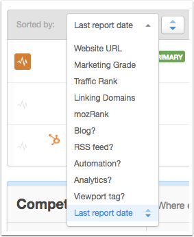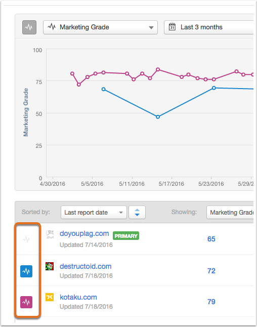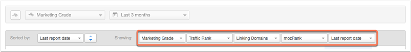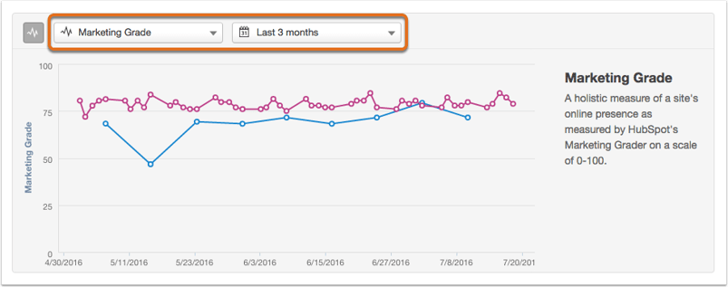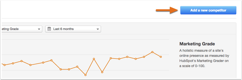- Note marketing : évaluation globale de la présence en ligne d'un site, mesurée par Marketing Grader de HubSpot sur une échelle de 0 à 100. Ces données sont collectées par le Marketing Grader de HubSpot. Pour consulter le détail de votre note ou de celle d’un de vos concurrents, cliquez sur la valeur présente dans la colonne Note marketing du rapport sur les concurrents.