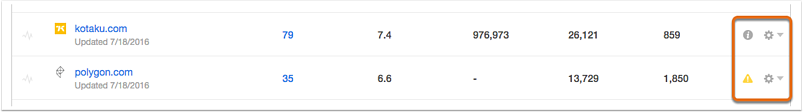 Vous verrez une icône i ou une icône ! jaune à côté de chaque concurrent. L'icône jaune indique que HubSpot n'a pas été en mesure de déterminer toutes les informations sur le site de votre concurrent. Cliquez sur l'icône ! pour remplir ces informations manuellement. Vous pouvez également cliquer à tout moment sur l’icône i pour mettre à jour les informations d’un site. Si vous souhaitez vérifier l’exactitude des données du rapport, cliquez sur ces deux icônes pour vous assurer que HubSpot suit les bons blogs et/ou profils sur les réseaux sociaux.
