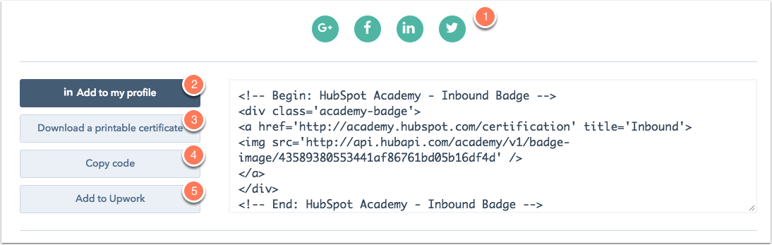 Lorsque vous avez obtenu une certification de HubSpot, vous pouvez la consulter, télécharger une copie imprimable, intégrer le badge de certification à votre site web ou l'ajouter à LinkedIn ou Upwork.