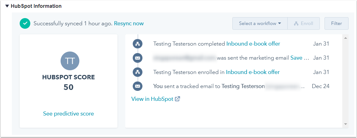 Après avoir terminé les étapes ci-dessus, accédez à une fiche d'informations de lead/contact dans Salesforce qui est synchronisée avec HubSpot. Si vous avez déjà ajouté le module Visualforce HubSpot à vos modèles de pages, le module sera mis à jour vers la nouvelle version.