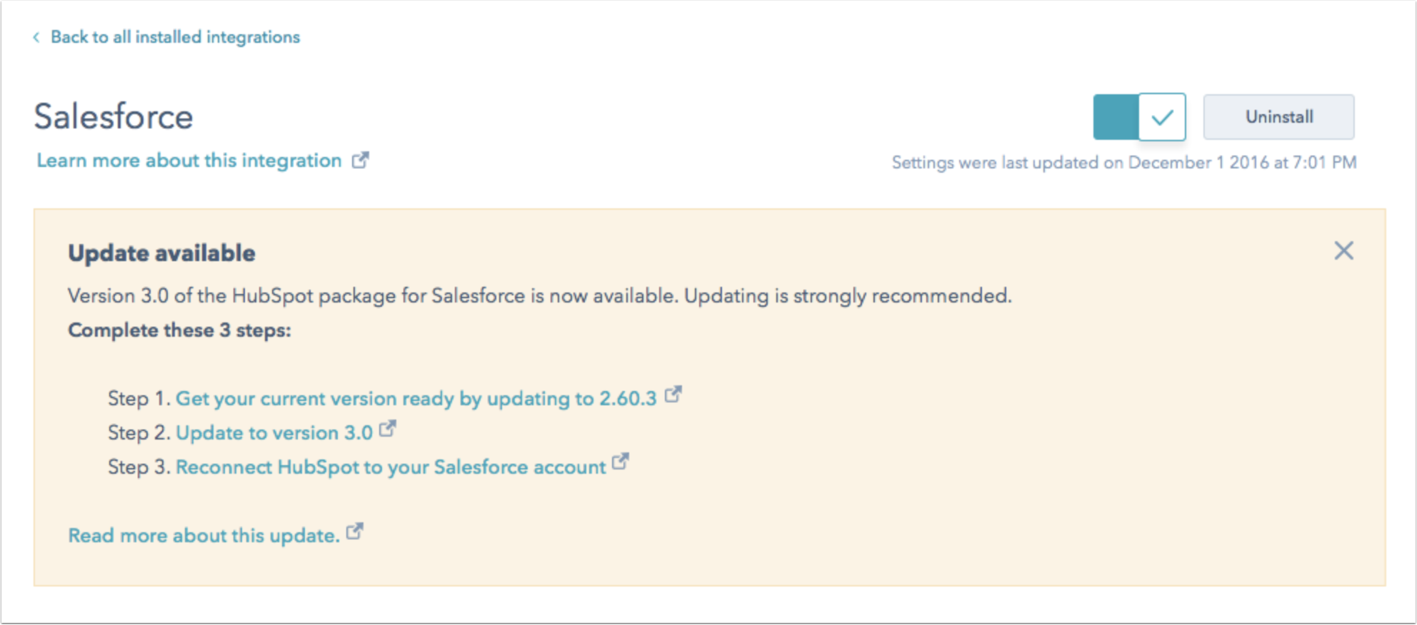 Vous pouvez vérifier que vous avez correctement mis à jour le package en accédant à Packages installés dans Salesforce et en veillant à ce que package HubSpot Integration soit en version 3.0.