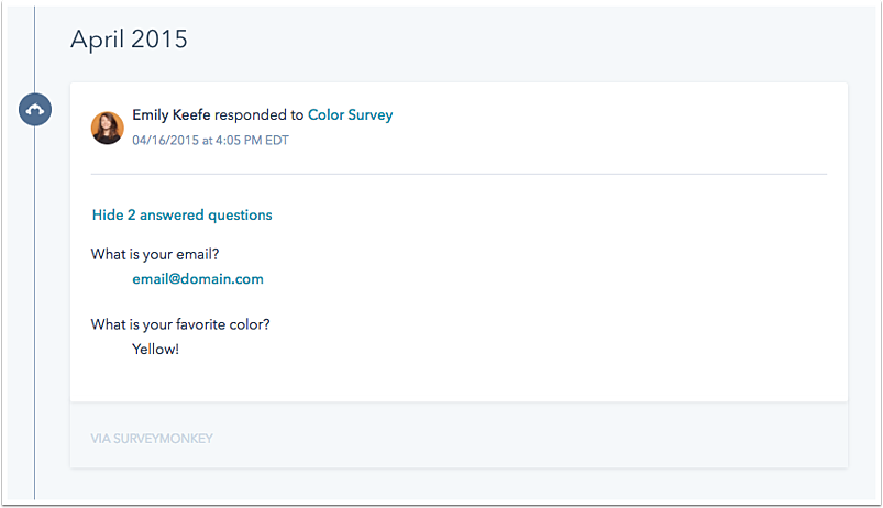 Once you've synced your SurveyMonkey surveys, survey responses will appear as activities on your contacts' timelines. If you have a SurveyMonkey Basic plan, the timeline event will show that the contact responded to the survey. If you have an annual paid SurveyMonkey plan, the timeline event will show a breakdown of your contacts' responses to specific questions.