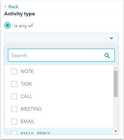 Filter contacts by activities on their contact record. Activities include meetings, conversations, tasks, notes, one-to-one emails, and phone calls that have been logged in HubSpot. You can filter a contact based on the activity details. Learn more about using activity properties in a filter.