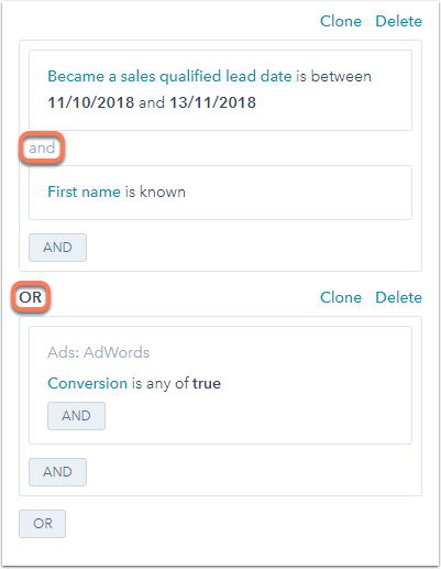 For example, you can create a list of contacts who became a sales qualified lead in a certain time and has their first name known, or contacts that converted through AdWords. This will result in a list that includes: