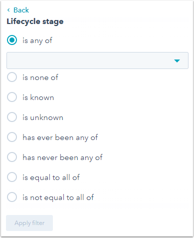 For example, the HubSpot Lifecycle Stage contact property is a radio select field type, so you can select existing or historical option values.