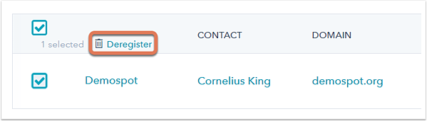 - To deregister a lead, select the checkbox to the left of a domain, or select all domains on the page by selecting the checkbox at the top-left of the domain table. Then, click Deregister.